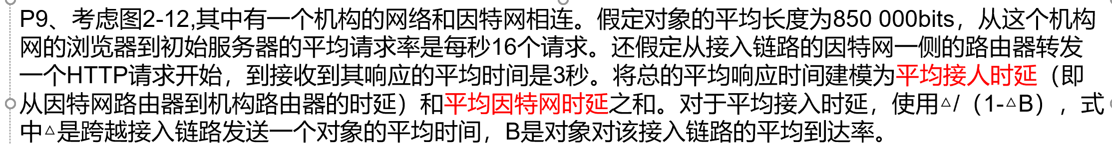 The traffic intensity on the link is given by =(16 requests/sec)(.0567 sec/request) = 0.907. Thus, the average access delay is (.0567 sec)/(1 - .907) = .6 seconds. The total average response time is therefore .6 sec + 3 sec = 3.6 sec.